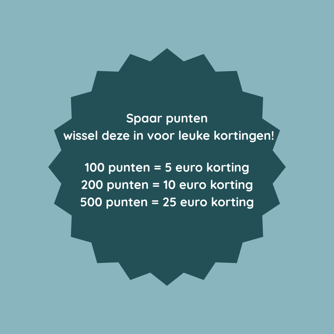 Leuk dat je meedoet met ons spaarprogramma! Bij elke aankoop spaar je automatisch punten die je kunt inwisselen voor korting. Makkelijk, overzichtelijk en vooral heel leuk!